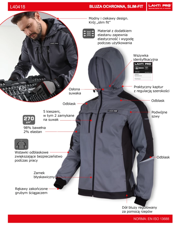 - Wstawki odblaskowe zwiększające bezpieczeństwo podczas pracy