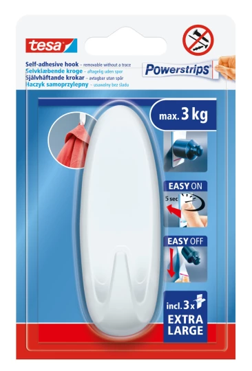 - Bardzo duży haczyk samoprzylepny zapewnia skuteczne mocowanie przedmiotów o masie do 3 kg, takich jak wieszaki na ubrania
