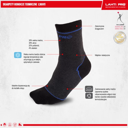- Zastosowanie wełny merino zapewnia szybkie odparowywanie wilgoci oraz bardzo wysokie właściwości termoizolacyjne