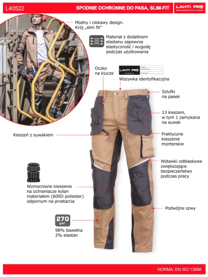 - Wzmocnione kieszenie na ochraniacze kolan materiałem (600D poliester) odpornym na przetarcia