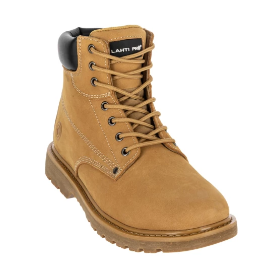 - MATERIAŁ: Wierzch: wysokiej jakości licowa skóra nubukowa. Podszewka: dzianina siatkowa. Wyściółka: wymienna, 1,5 cm grubości w części pięty, miękka i elastyczna. Podeszwa: gumowa o właściwościach antypoślizgowych (podłoże z płytek ceramicznych pokryte gliceryną), odporna na olej napędowy, głęboki bieżnik zwiększa przyczepność do podłoża