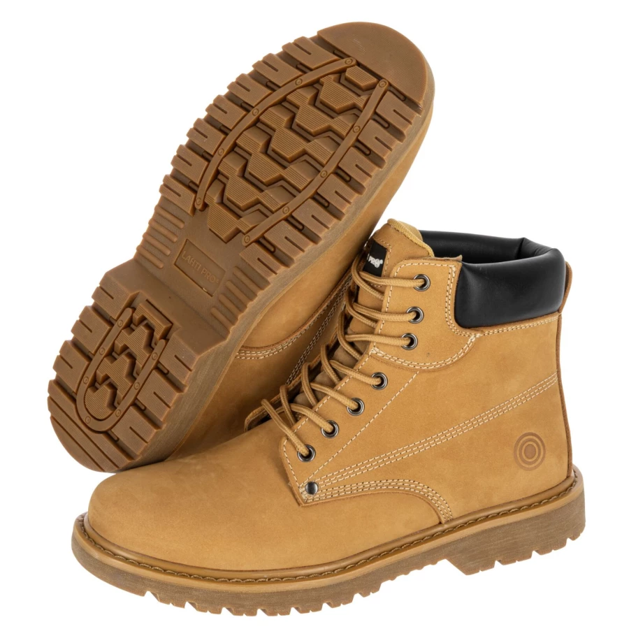 - MATERIAŁ: Wierzch: wysokiej jakości licowa skóra nubukowa. Podszewka: dzianina siatkowa. Wyściółka: wymienna, 1,5 cm grubości w części pięty, miękka i elastyczna. Podeszwa: gumowa o właściwościach antypoślizgowych (podłoże z płytek ceramicznych pokryte gliceryną), odporna na olej napędowy, głęboki bieżnik zwiększa przyczepność do podłoża
