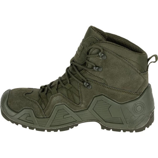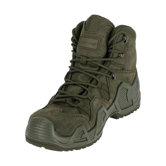- MATERIAŁ: Wierzch: skóra zamszowa/tkanina typu Oxford o właściwościach hydrofobowych. Podszewka: wbudowana oddychająca i wodoodporna skarpeta z membraną/dzianina siatkowa. Wyściółka: wymienna (wkładki z elastyczną poduszką tłumiącą wstrząsy oraz podkładką łagodzącą nacisk stopy na podłoże). Podeszwa: gumowa, głęboki bieżnik zwiększa przyczepność do podłoża