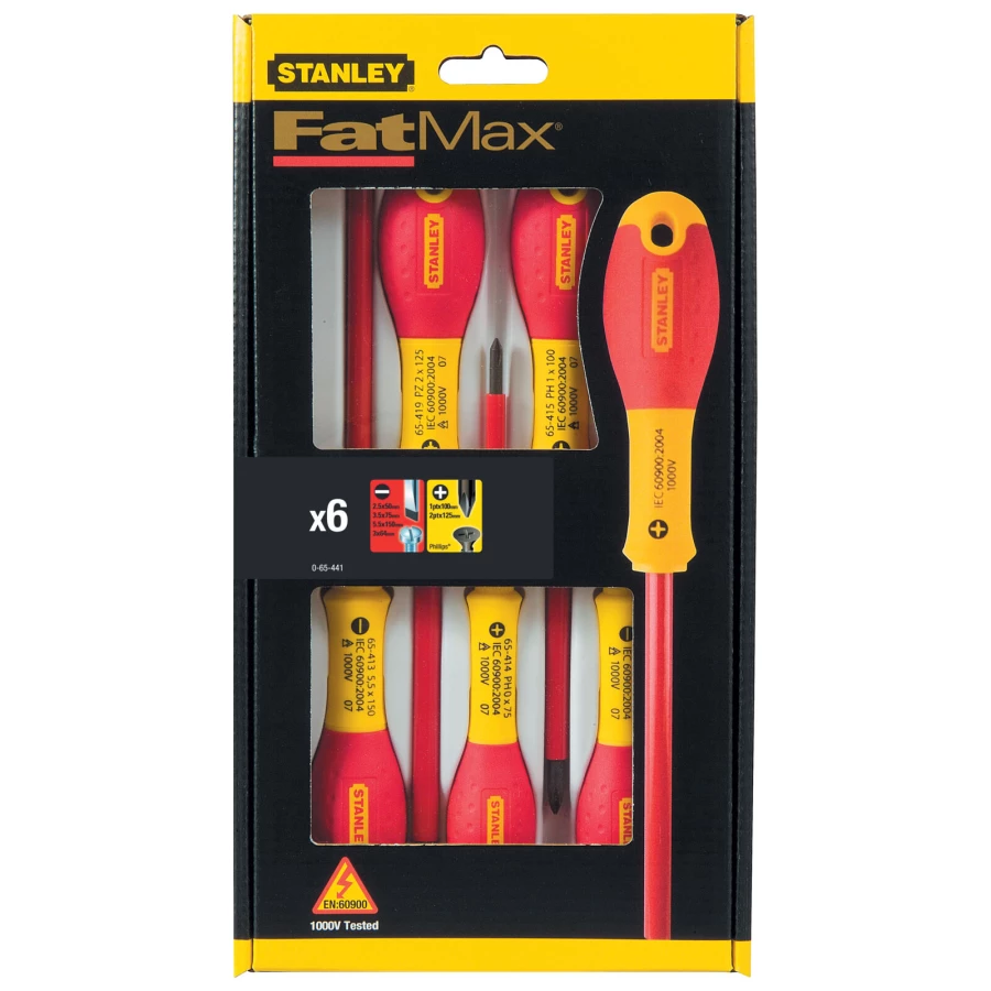 - 654410 – zestaw 6 szt. wkrętaków dla elektryków (EN60900): Pł równ., 5 x 50 mm; 3.5 x 75 mm; 5.5 x 150 mm; Phillips Ph 1 x 100 mm; Ph 2 x 125 mm; Tester napięcia
